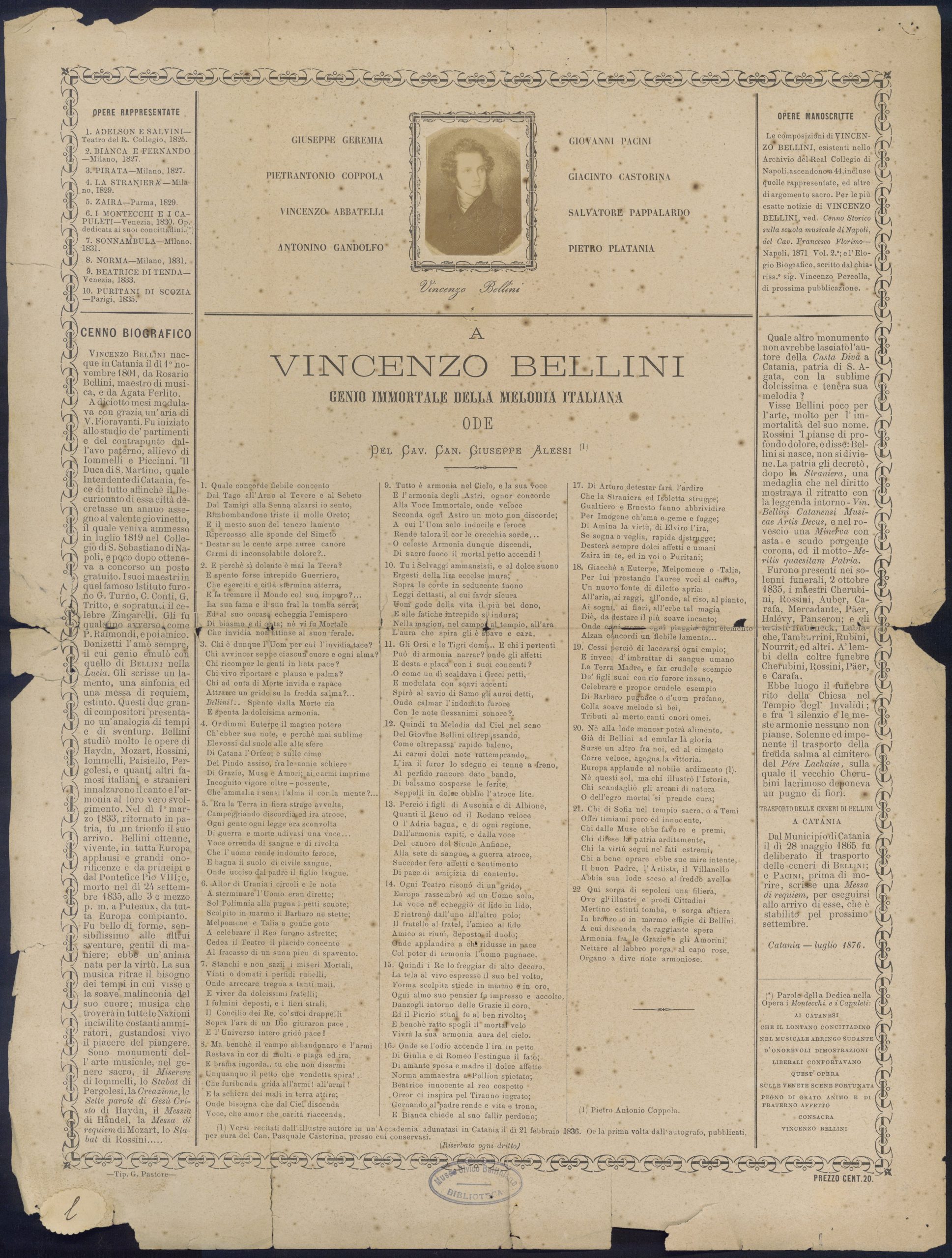 • Titolo: A Vincenzo Bellini genio immortale della melodia italiana : [Catania], 21 febbraio 1836