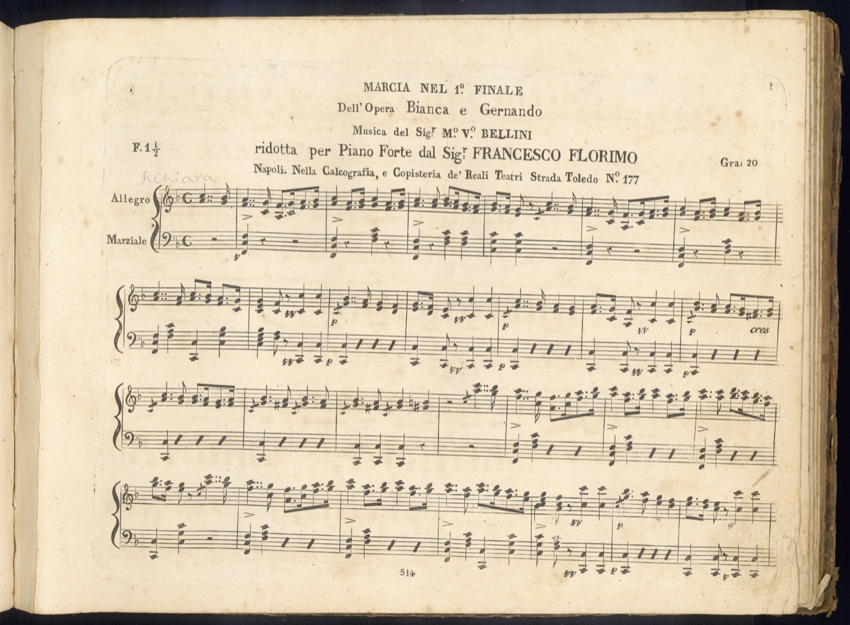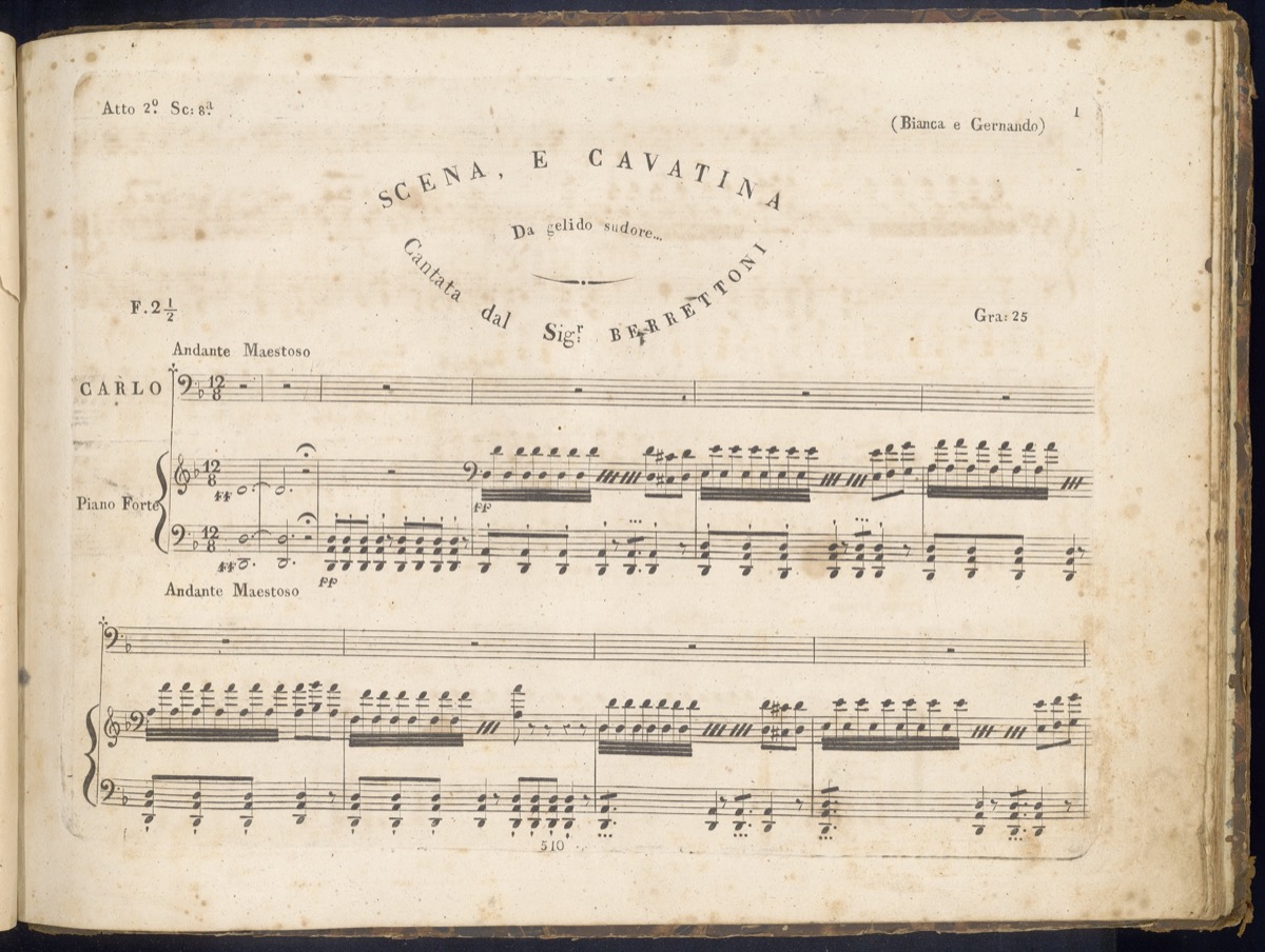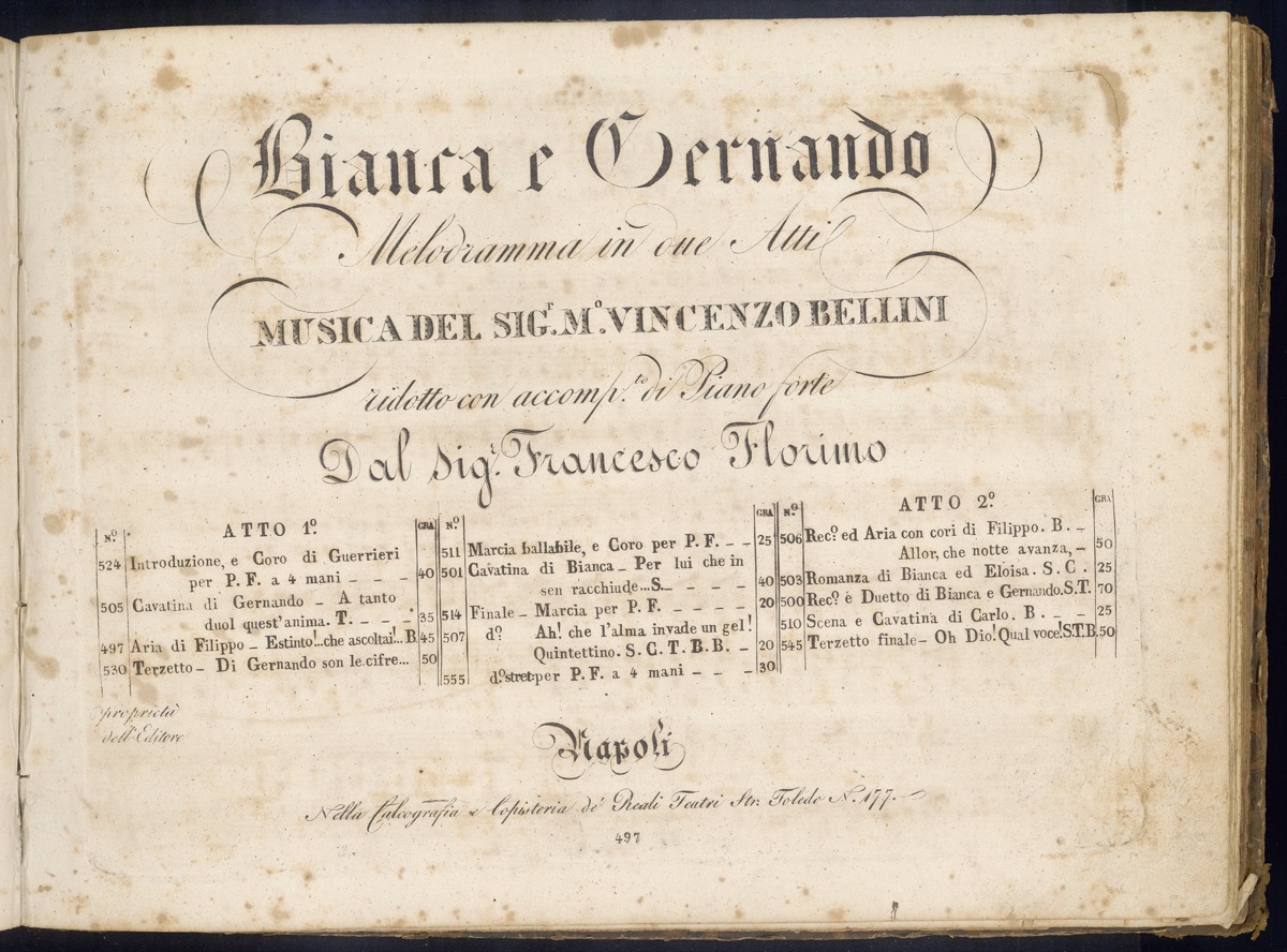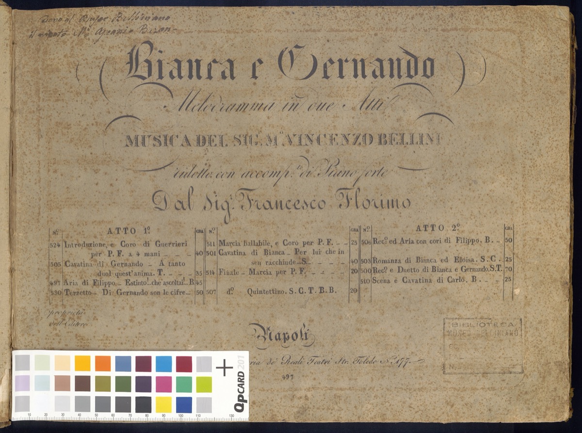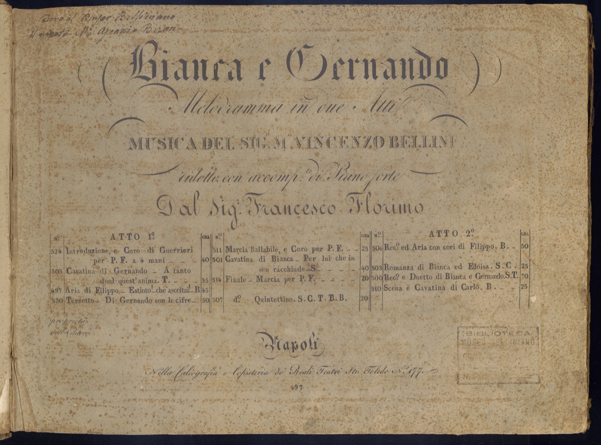 - Titolo: Bianca e Gernando : melodramma in due atti / musica del Sig.r M.o Vincenzo Bellini ; ridotto con accomp.to di piano forte dal Sig.r Francesco Florimo