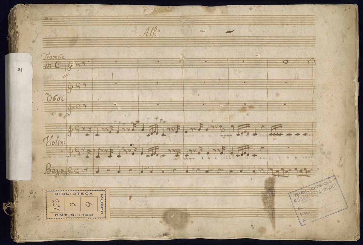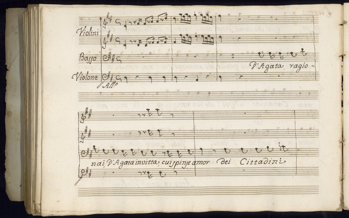 Eseguito nel piano dell’Università di Catania per la festa estiva di S. Agata del 1802; Titolo assente, ricavato dal libretto I-CATc Civ.Misc.B.41.27; Vuote cc. 110v, 111, 112; Legatura danneggiata.